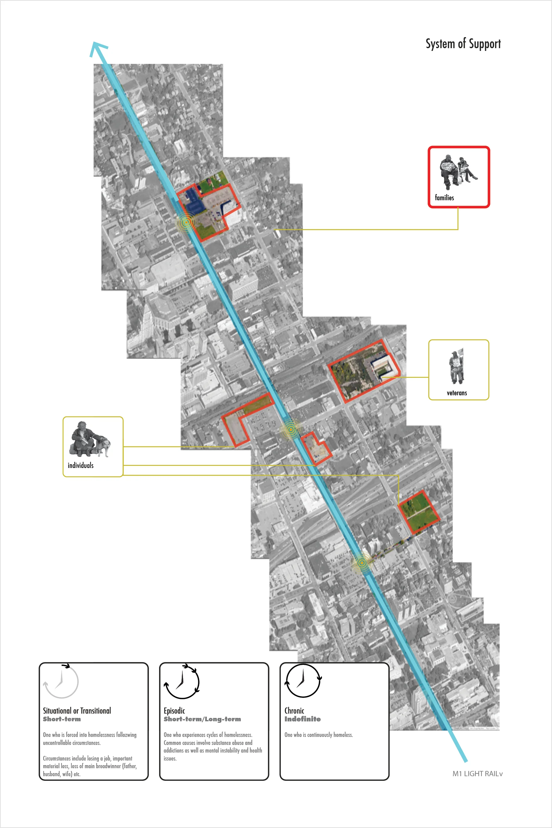 The agency of architecture will be explored in the form of an urban campus along a proposed system of nodes, each targeted toward various states and classifications of displaced individuals. Specifically, the homeless family household will be the first model tested. The M-1 Light Rail plays an integral role as it will serve as the spine: providing the arterial connection to each other and the city. The aggregation of campuses will not only provide for the homeless, they will contribute to the city at large; rendering civic spaces and services derived from local programmatic scarcity. The campus explores the fusion of unlikely adjacencies and user interactions intended to create an environment of inclusion.